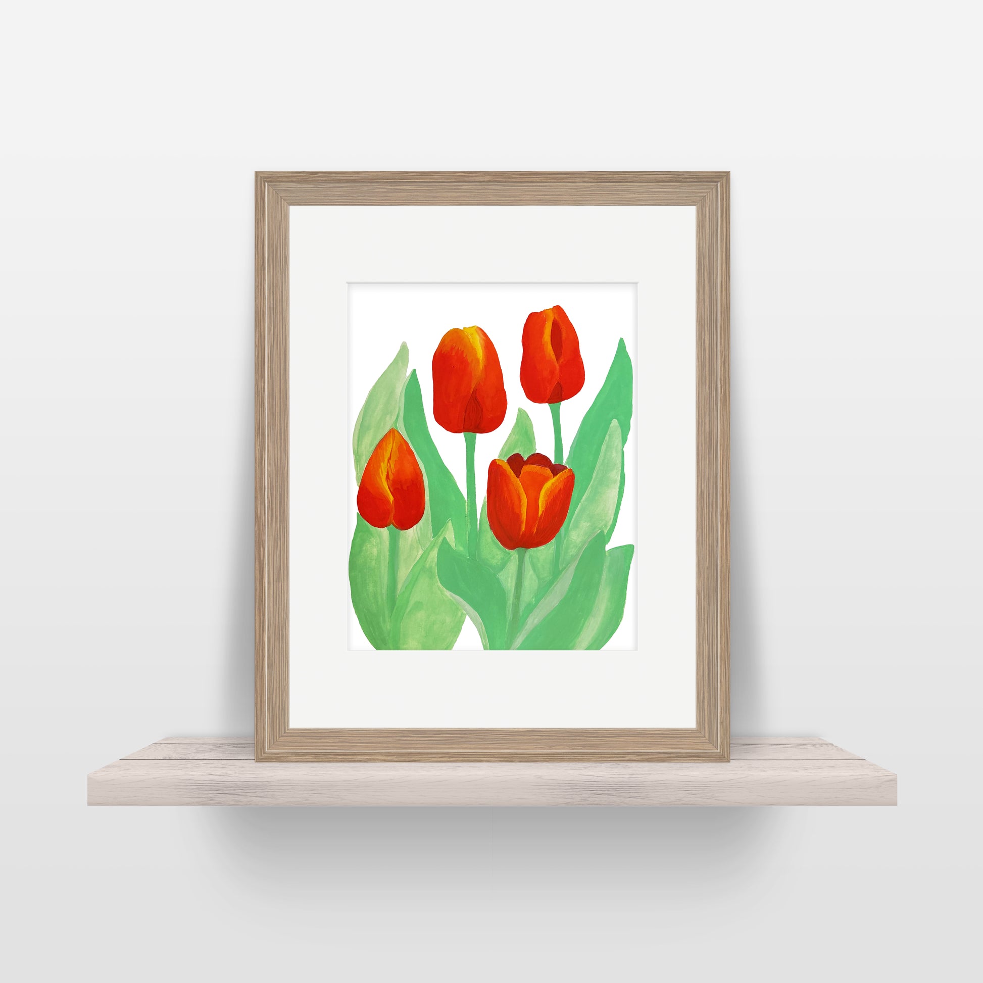 Bring the beauty of spring inside with this vibrant Red Ardem Tulip gouache painting. Rendered in striking crimson and lush green against a clean white background, this matte-textured artwork is a lovely rendition of tulip flowers.